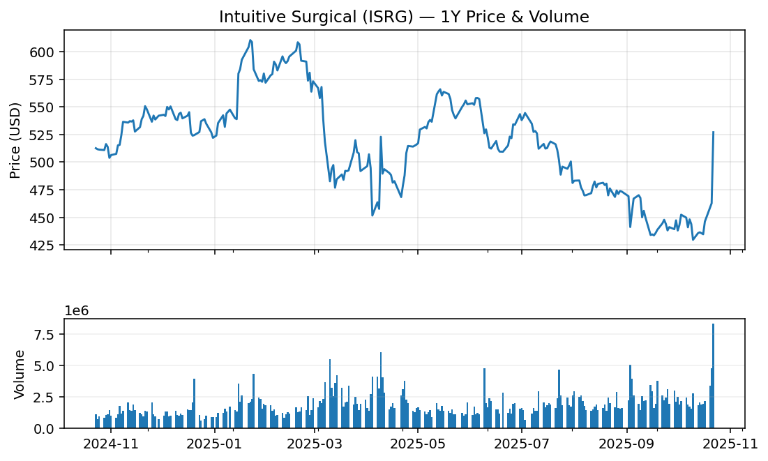 ISRG1-Year Price·Volume — Volume spikes around earnings dates prove the 'surprise' factor.