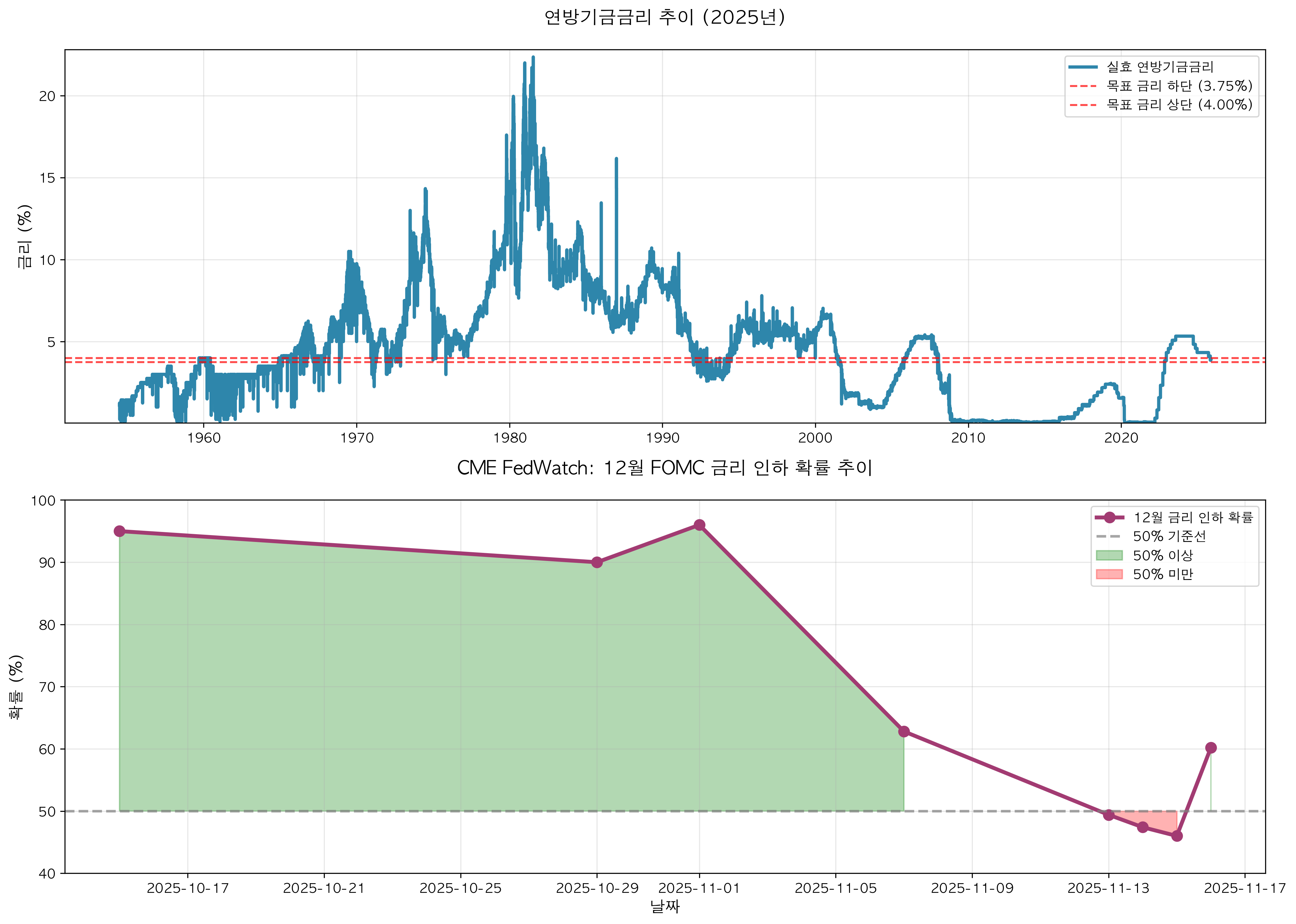 12월 금리 인하 확률이 한 달 만에 95%에서 50% 미만으로 급락했습니다. AI 및 기술주 변동성이 심화되며 엔비디아 실적 발표를 앞두고 시장이 긴장하고 있습니다. 43일간의 정부 셧다운이 종료되며 경제 데이터 발표가 재개되어 시장 불확실성이 증가하고 있습니다.