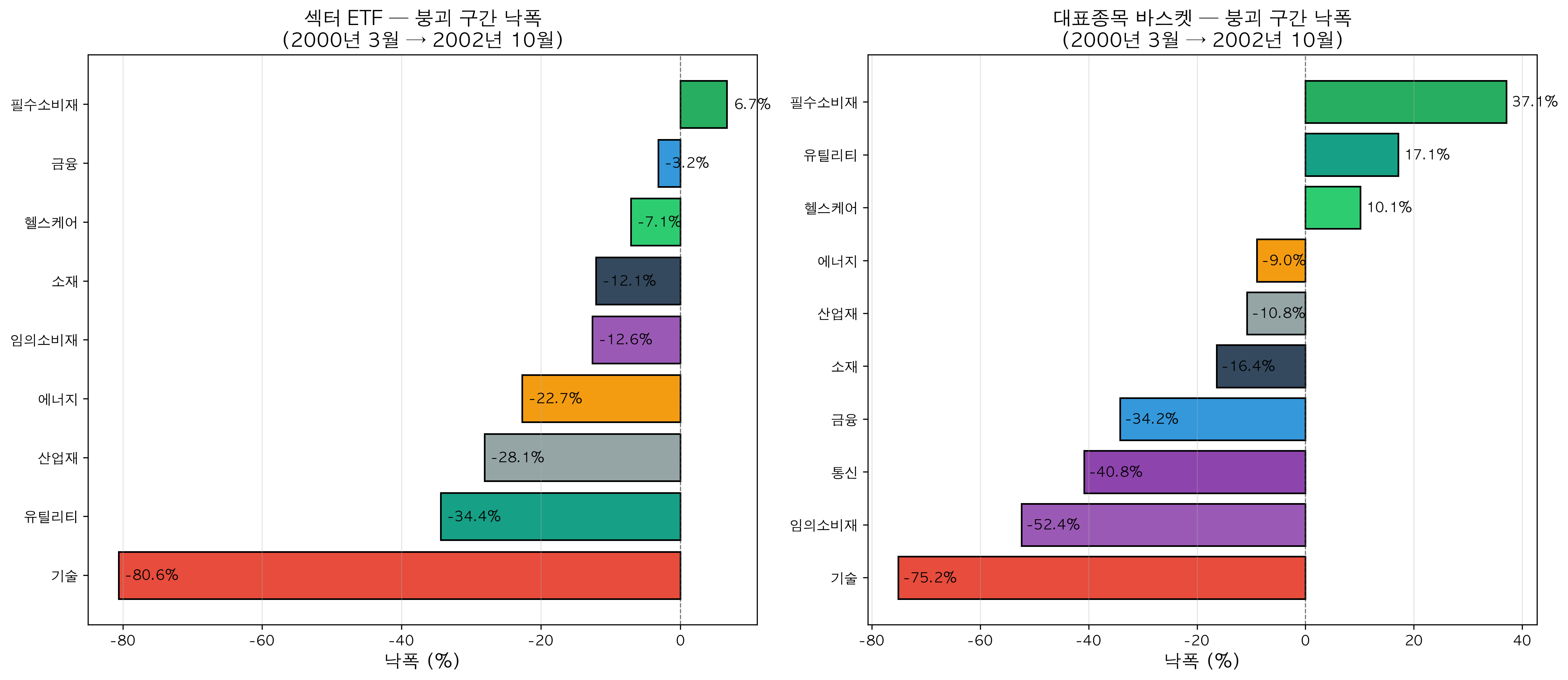 그림: 2000년 3월~2002년 10월 붕괴 구간 섹터별 낙폭 (왼쪽: ETF, 오른쪽: 대표 종목 바스켓)