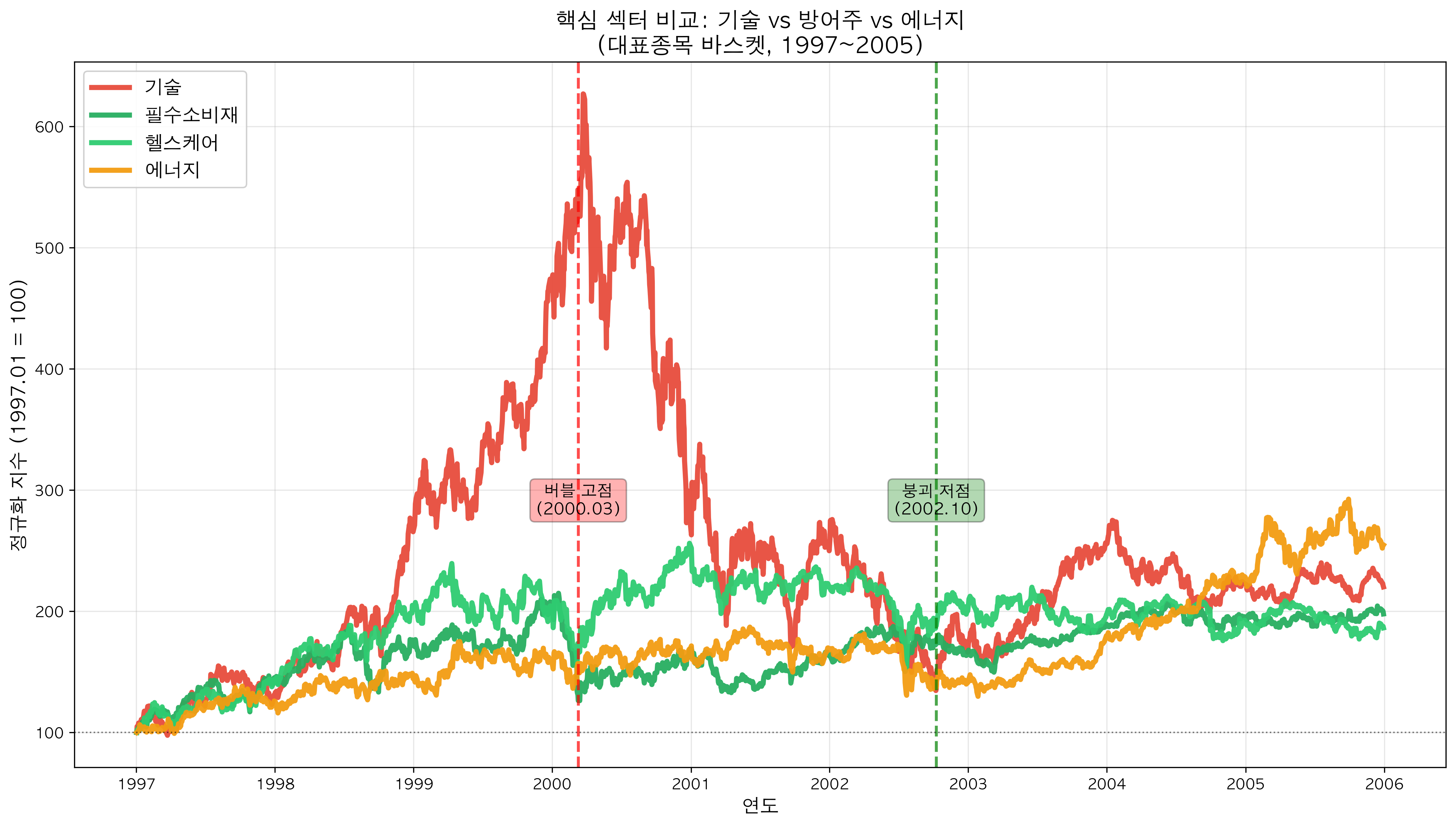 그림: 닷컴 버블 전후 핵심 섹터 추세 비교 — 기술주는 폭락, 필수소비재는 상승, 에너지는 회복기 강세