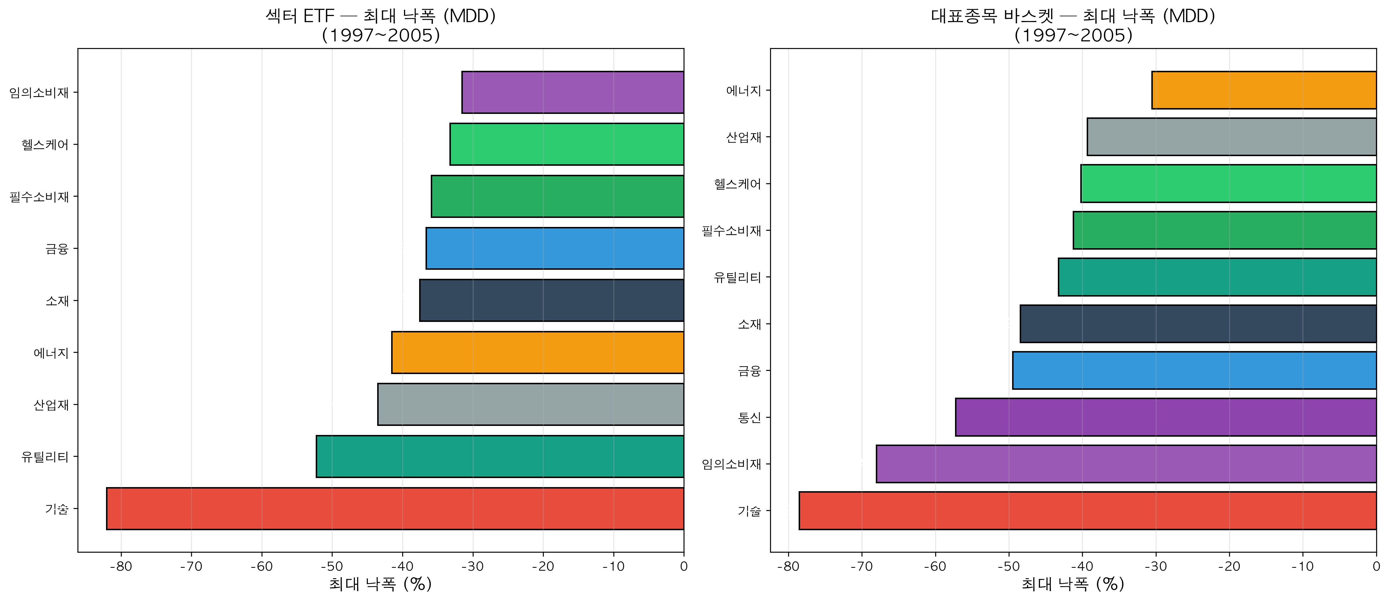 그림: 1997~2005년 기간 동안 각 섹터의 최대 낙폭(MDD) 비교