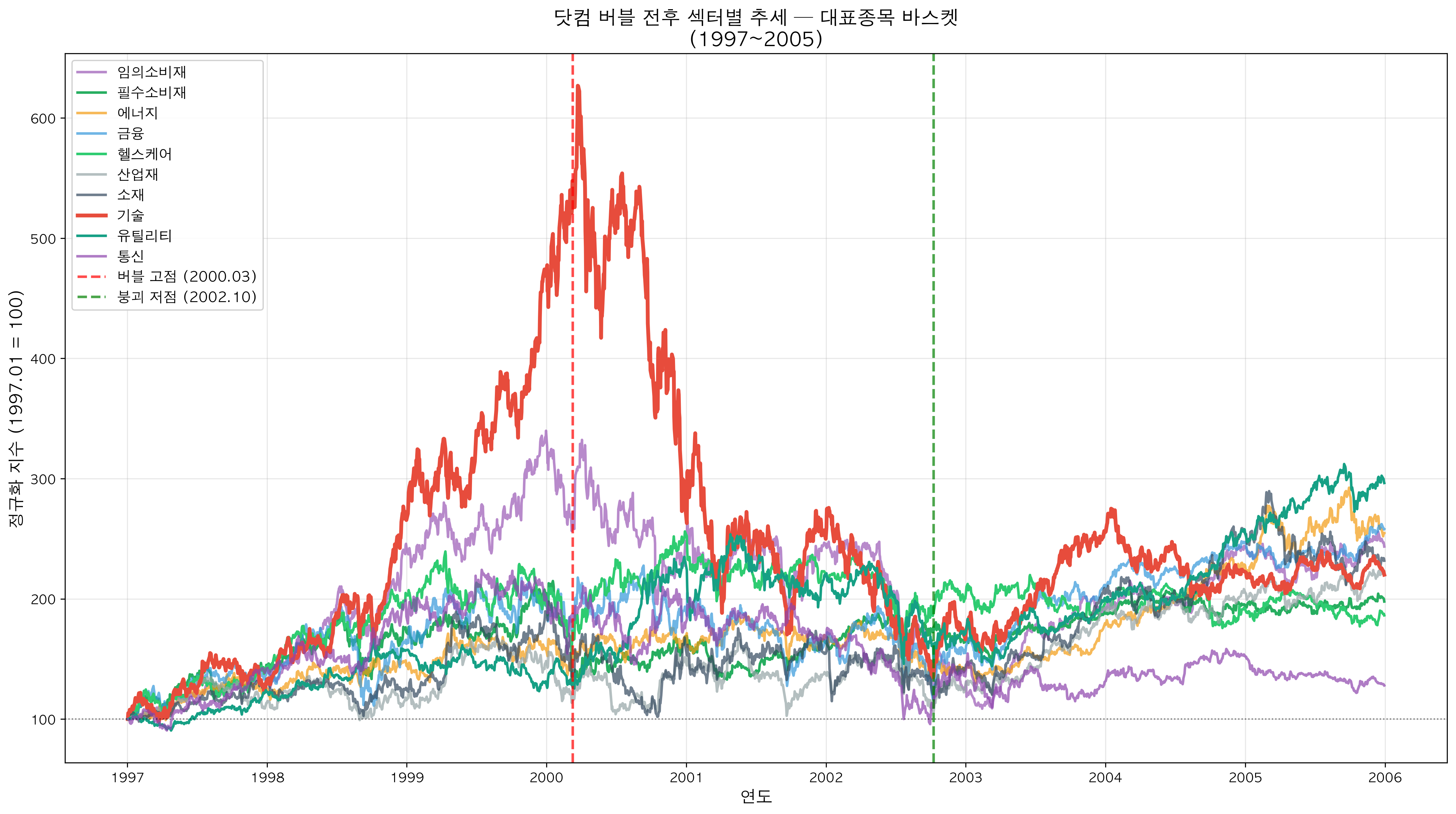 그림: 닷컴 버블 전후 전체 섹터 추세 — 대표 종목 바스켓 (1997~2005)