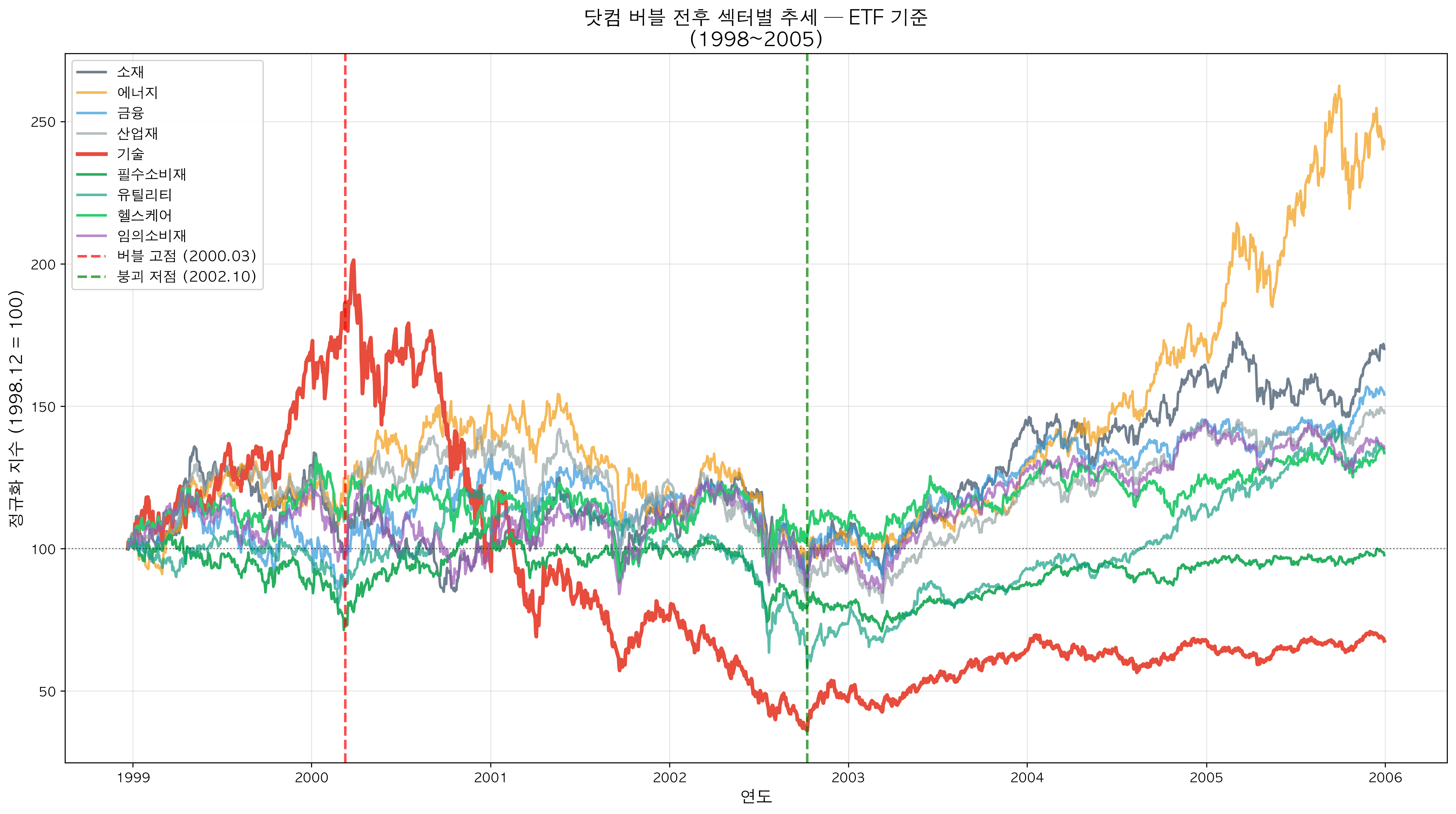 그림: 닷컴 버블 전후 전체 섹터 추세 — ETF 기준 (1998~2005)