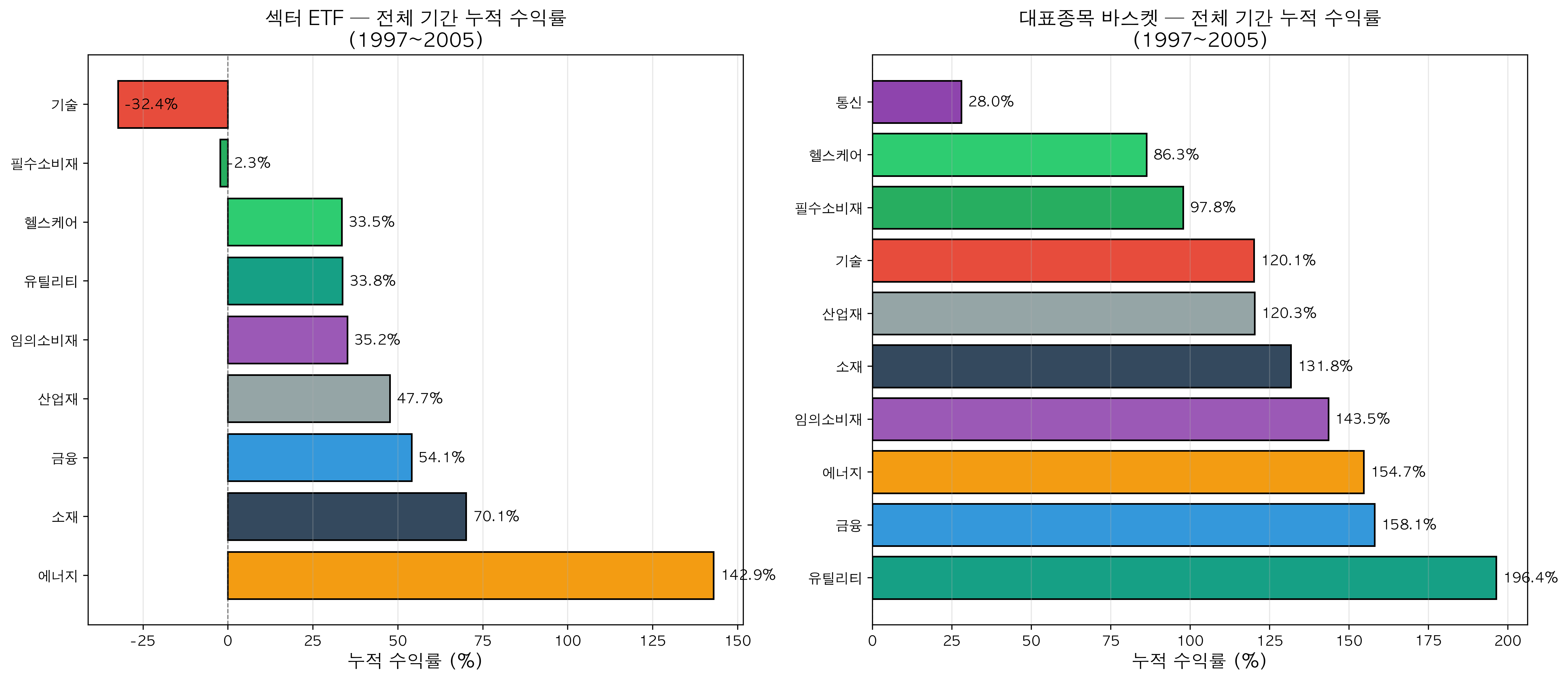 그림: 1997~2005년 전체 기간 누적 수익률 비교 (왼쪽: ETF, 오른쪽: 대표 종목 바스켓)