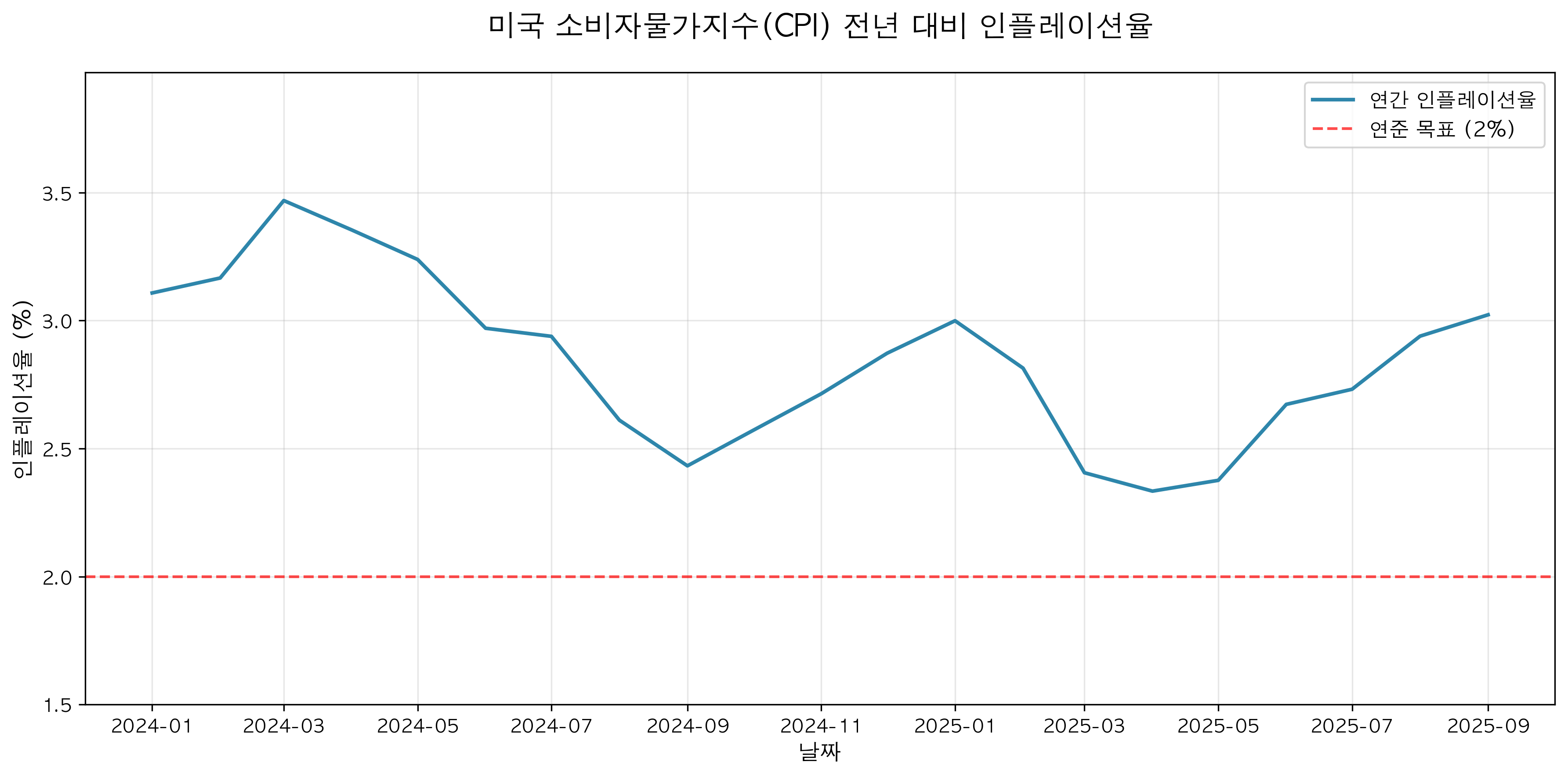 그림: 미국 소비자물가지수(CPI) 전년 대비 인플레이션율 — 연준 목표 2%를 향해 둔화 추세
