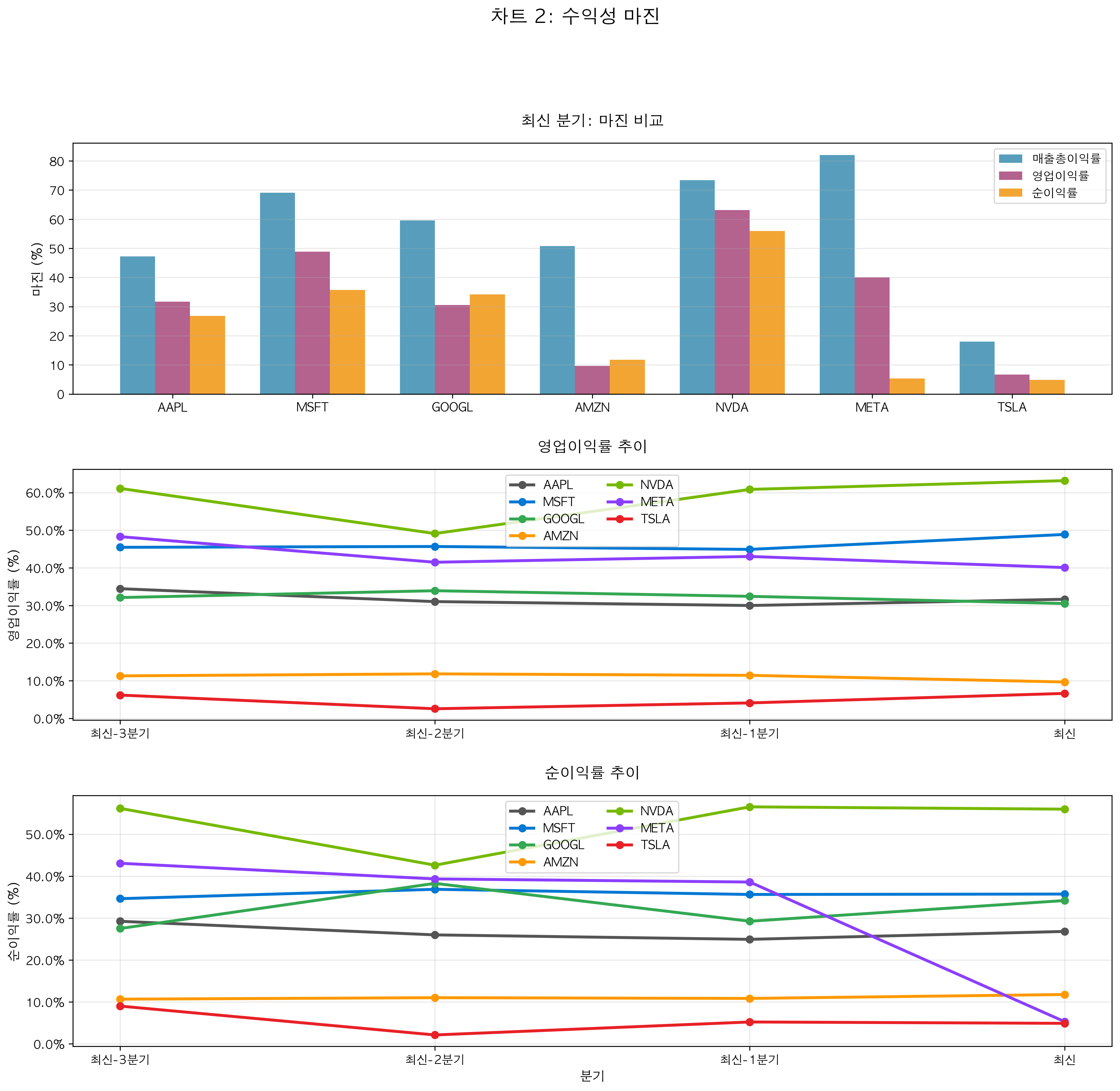그림 3: 수익성 마진 분석 - 최신 분기 비교(상단), 영업이익률 추이(중간), 순이익률 추이(하단)