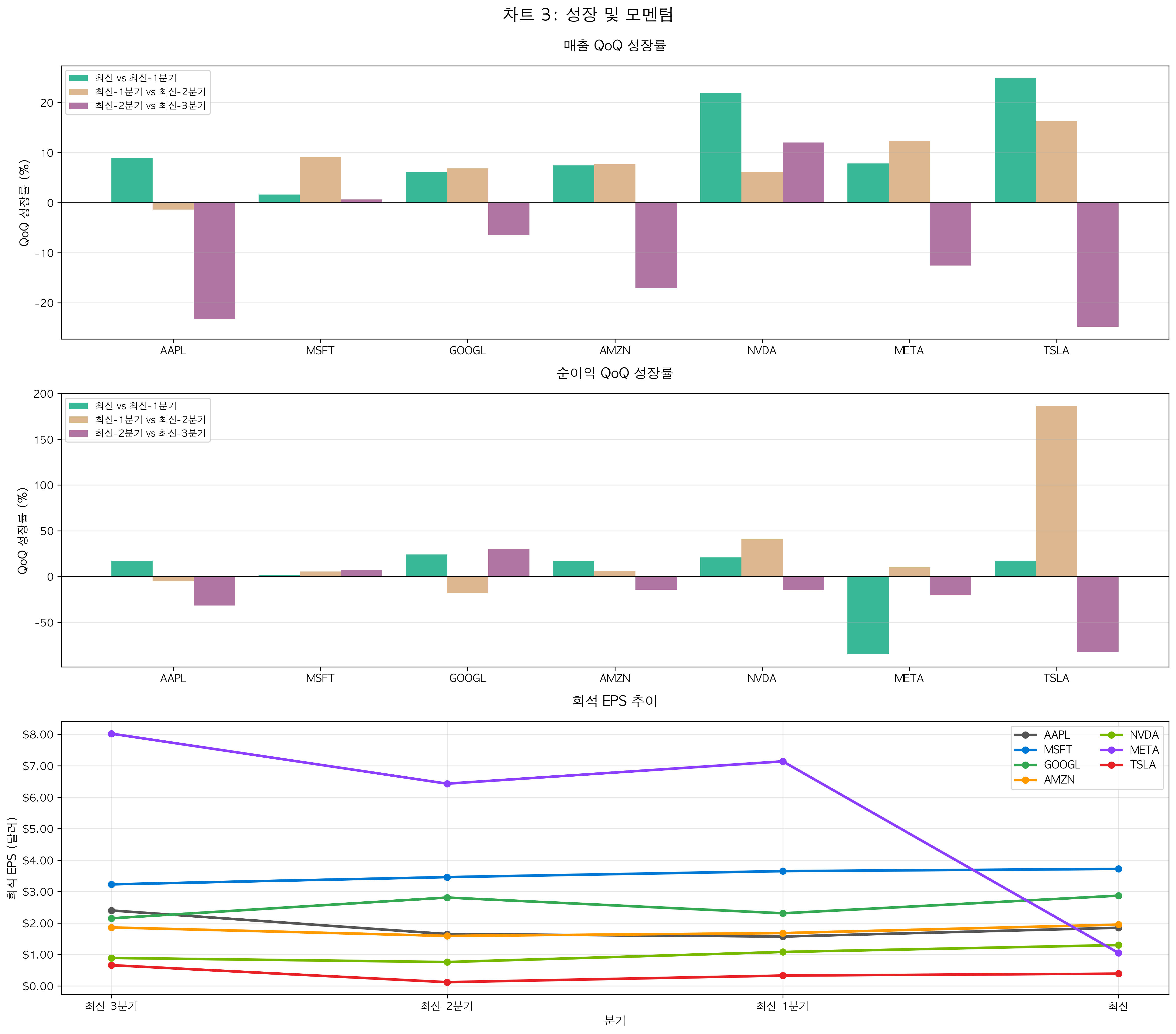 그림 2: 성장 및 모멘텀 분석 - 매출 성장률(상단), 순이익 성장률(중간), EPS 추이(하단)