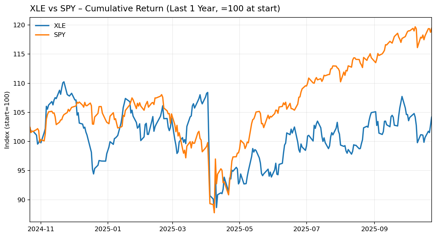 캡션: 에너지 섹터(XLE)와 S&P 500(SPY)의 최근 1년 누적 수익률 비교. 유가 급등 구간에서 XLE가 지수를 초과 수익(아웃퍼폼)했는지, 이후 되돌림이 있는지를 한눈에 파악할 수 있다. 상대강도 추세가 유지되는지 여부가 섹터 로테이션의 핵심.