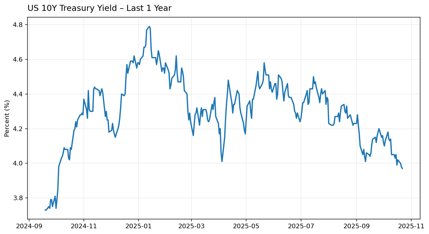 캡션: 최근 1년간 미국 10년물 국채금리(종가 기준). 지정학·무역 리스크가 커질 때 안전자산 선호로 금리가 하락(채권 가격 상승)하거나, 반대로 물가/성장 우려가 부각되면 금리가 상승하는지 흐름을 읽을 수 있다. 성장주의 밸류에이션 민감도와 직결된다.