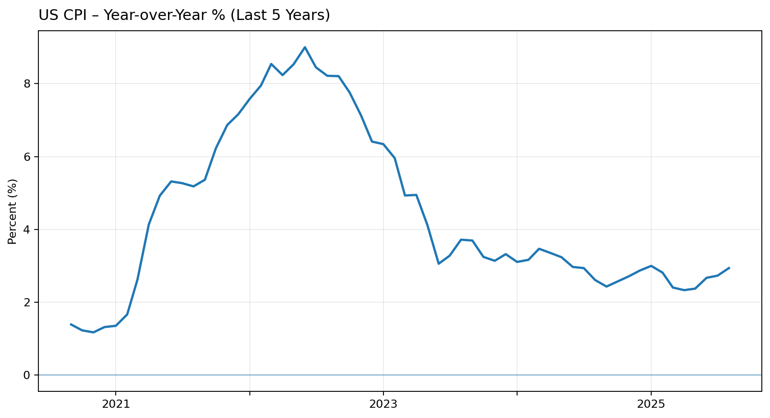 캡션: 미국 CPI의 전년동월 대비(%) 변화율. 꺾이는 구간은 물가 압력이 완화되는 신호로, 금리 인하 기대를 자극할 수 있다. 반대로 재상승(특히 에너지·주거·임금 영향)이 나타나면 완화 기대가 약해져 주식시장 변동성이 커진다.