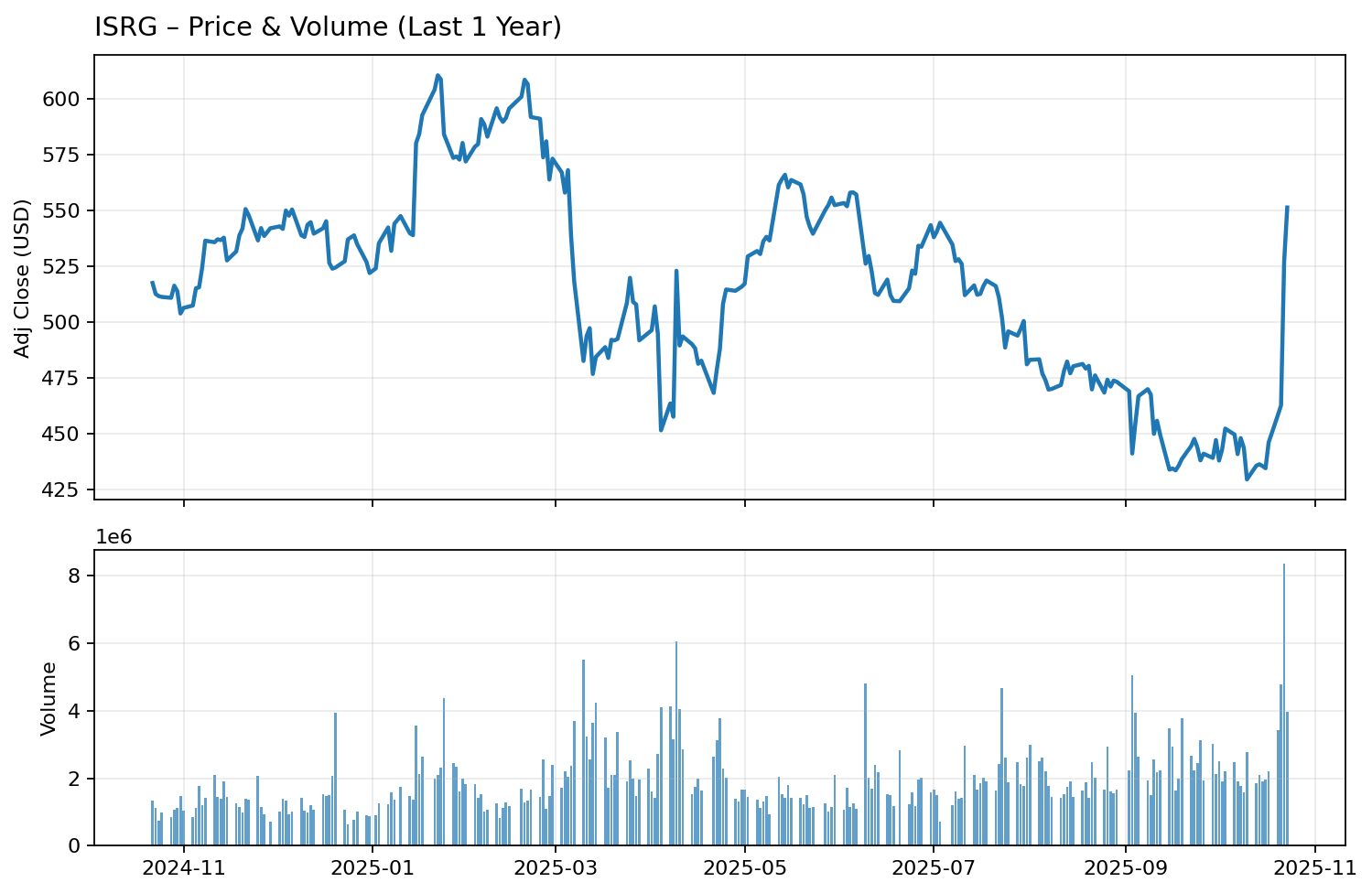 캡션: 최근 1년간 ISRG 일간 종가(상단 라인)와 거래량(하단 바). 실적 발표 전후의 갭(시가 점프)과 거래량 급증이 '기대 vs 현실'이 충돌하는 지점이다. 큰 바와 함께 상방 캔들이 나오면 호재에 힘이 실렸다는 신호로 해석되기 쉽다.